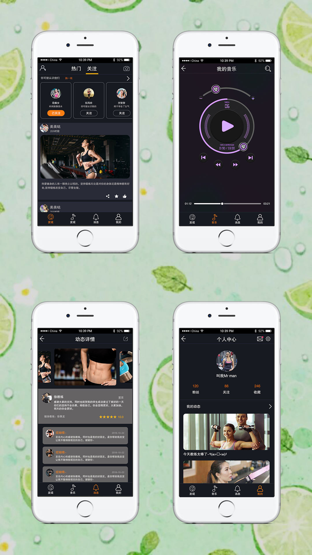 大家的生活越来越好,我们越来越忙,我们生活的时候往往就忘了我们的身体,导致现在我们的身体处于亚健康状态。所以现在大家都开始注意自己的身体,开始各种健身、瑜伽等等,所以我们大家是时候开始锻炼了。我们根据客户是要求,开发了这款健身APP,欢迎大家使用,APP功能大致如下:
